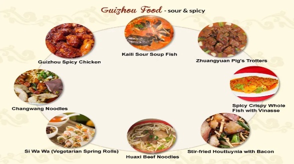 Food there mainly consists of Qian cuisine and local snacks. Hot, spicy and sour are the three most featured flavors of Qian cuisine. The most famous dishes include Suan Tang Yu (Sour Soup Fish) and griddle cooked dishes. Well-known snacks include Chang Wang Noodle, Lian’ai Doufu Guo and Si Wa Wa. Another Guizhou specialty is Maotai Liquor, which is considered the national liquor of China national liquor and one of the world’s three best distilled liquors along with whisky from the United Kingdom and French brandy. Rice wine made by local farmers is also a famous specialty. The area is also famous for its batik fabrics, silver decorations of the ethnic groups, bacon and Chinese medicine.